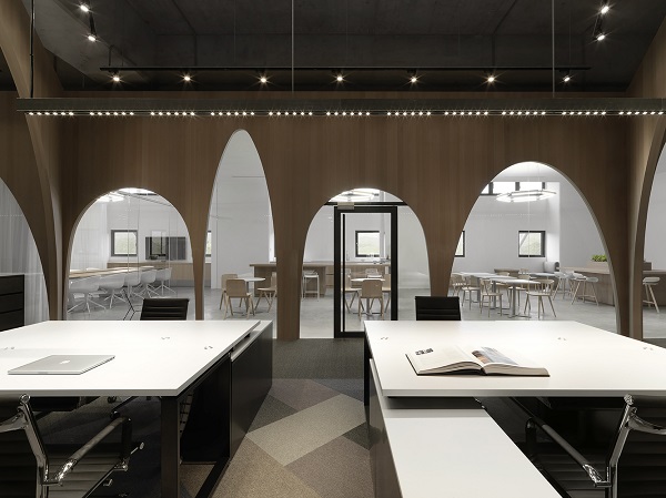 2、考慮到辦公室裝修需要的空間性。設(shè)計(jì)師結(jié)合自身創(chuàng)意,設(shè)計(jì)了一個(gè)個(gè)用柱子支撐的空間結(jié)構(gòu),就像巴黎教堂的穹頂一般。巨大的柱子帶來(lái)的大跨度和場(chǎng)地的高屋頂以及隨處可見(jiàn)的鏡面和玻璃隔板,創(chuàng)造出一個(gè)兼具創(chuàng)造性和實(shí)用性的辦公室空間。整個(gè)辦公室設(shè)計(jì)被稱為“修道院”,包括一個(gè)L型的大廳,周圍的拱廊,一面面對(duì)建筑的室內(nèi)并且可以遠(yuǎn)望的庭院。通過(guò)創(chuàng)造人體尺度的辦公空間小組和放松的其他區(qū)域,這項(xiàng)辦公室設(shè)計(jì)既滿足了辦公所需的私密性,同時(shí)又保持了一種中性的工作環(huán)境。