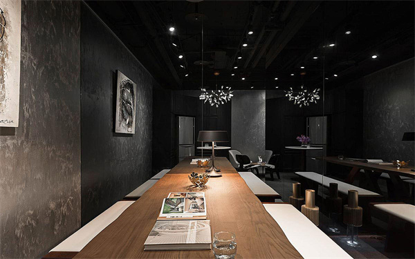 2、現(xiàn)代風(fēng)辦公室茶水間裝修設(shè)計:壁面刷上特殊漆,利用手繪的溫度創(chuàng)造視覺層次,結(jié)合主燈及點狀燈的光影烘托,**提升空間質(zhì)感。此外,茶水間內(nèi)部除了擺設(shè)圓桌、跳色單椅外,更安排了一張木質(zhì)長桌,增加座位席,同時亦為空間注入溫潤感受,更運用收納高柜將各式電器藏于立面中,辦公室設(shè)計師巧手將坪效發(fā)揮得****,打造宛如VIP等級的休憩空間。